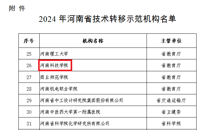 近日,河南省科学技术厅印发《关于公布2024年河南省技术转移示范机构的通知》,我校被认定为河南省技术转移示范机构,这是我校继获批河南省高校科技成果转化和技术转移基地后,在技术转移和成果转化工作上的又一突破。