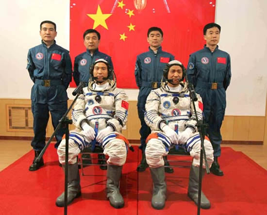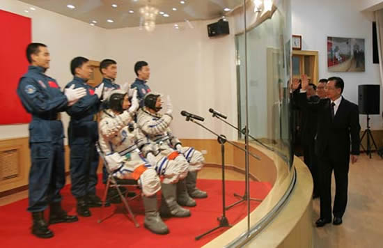 10月12日5时20分,温家宝、李长春、罗干等来到酒泉卫星发射中心航天员公寓问天阁,会见执行神舟六号载人航天飞行任务乘组梯队的6名航天员。