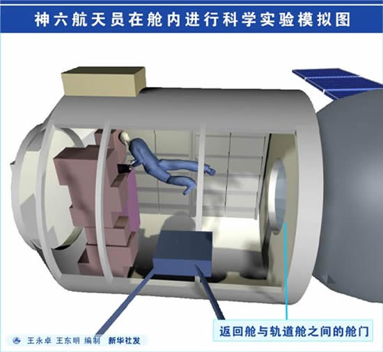 神六航天员在舱内进行科学实验模拟图