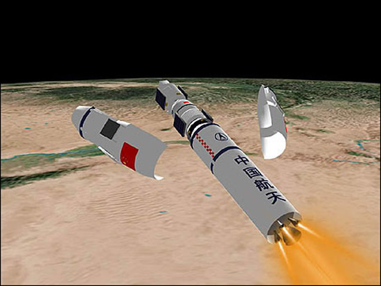 长征-2F火箭发射全过程示意图:整流罩分离后视