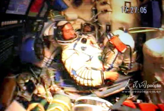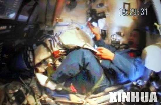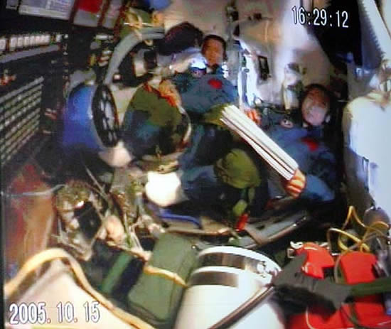 中共中央总书记、国家主席、中央军委主席胡锦涛同神舟六号航天员亲切通话。这是航天员在飞船返回舱内通话的场景。