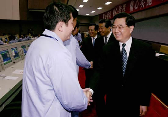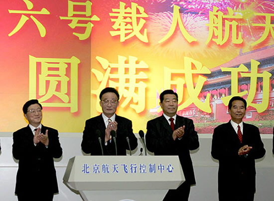 10月17日凌晨,神舟六号飞船成功返回地面。中共中央政治局常委吴邦国、贾庆林、黄菊、吴官正等在北京航天飞行控制中心观看飞船返回实况。吴邦国宣读中共中央、国务院、中央军委贺电。