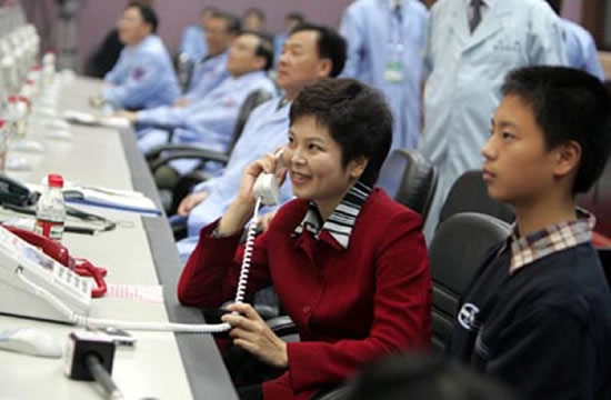10月12日21时30分,航天员费俊龙的妻子王洁正在与神舟六号上的丈夫费俊龙进行天地通话