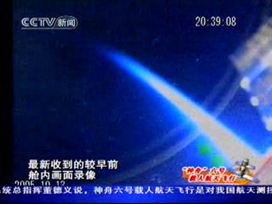 10月12日18时29分,独自留在返回舱里的航天员聂海胜在太空失重环境下抛飘浮的相机。