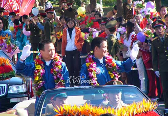 航天英雄费俊龙、聂海胜在太空遨游115小时32分后,胜利回到航天城,受到数千各界群众的热烈欢迎。