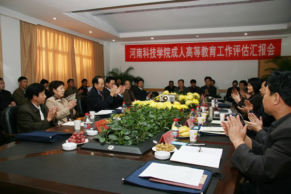 我校是本批河南省普通高校成人高等教育教学水平评估的首家被评单位,本次评估得到了校党政领导的高度重视。10月23日上午8时30分,成教评估工作汇报会在我校学术交流中心三楼会议室召开。校党政领导张玉珍、郭海波、王清连、梁赖、王文鹏、张民校、郭海山等及有关职能部门负责人出席了会议。会议由副院长梁赖主持,校党委副书记张玉珍致欢迎词,副院长王清连作了专题汇报。汇报详细介绍了学校的基本情况、学校成人高等教育概况、学校成人高等教育取得的主要成绩、主要办学特色、我校成教工作的不足之处及今后的工作思路。