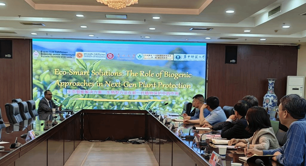 Wishwajith 教授以“Eco-SmartSolutions:The Role of Biogenic Approaches in Next-Gen Plant Protection”为题作学术报告。报告系统阐述了国际联合实验室在茶叶绿色安全生产方面的研究进展,结合团队最新研究成果,深入分析了利用生物水解物提升作物抗逆性、改良土壤环境的技术路径,以及在蔬菜和谷物生产中的实际应用案例。Wishwajith教授特别强调了研发新型纳米生物农药在有害生物防治领域的重要价值。报告结束后,与会师生就生物技术推广、跨学科合作等议题与 Wishwajith 教授进行了深入交流。