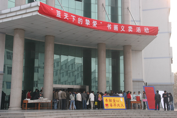 初冬的风劲冷,但挡不住师生火热的心,同学们早早地来到义卖现场,许多教职工不断的询问孩子治疗情况,有什么困难,需要什么帮助。在书画义卖现场,一位同学捐出了50元,当问他要什么书画时,他说:“我什么也不要,只是表达一下心情,表达对师恩的回报”,10元、20元、100元……,虽然有的素不相识,却伸出一双双友谊之手,奉献出一颗颗挚诚的爱,演绎出一段段校园真情。