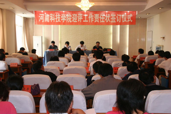 党委副书记张玉珍同志宣读了本科教学水平评估工作目标责任状。随后,各单位党政负责人依次上台与党委书记严全治、校长王清连签订了责任状。