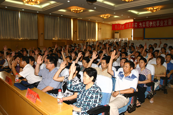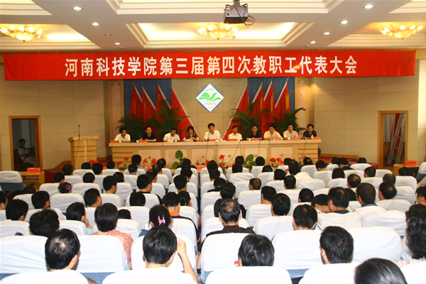 7月6日上午,我院在图书馆二楼报告厅隆重举行第三届第四次教职工代表大会,审议并通过《河南科技学院事业发展“十一五”规划》。院党政领导严全治、齐毅、张玉珍、郭海波、王清连、梁赖、王文鹏、刘兴友、张民校、郭海山等出席会议,133名代表参加会议。