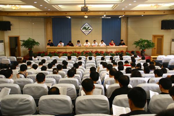 会上,党委副书记齐毅首先宣读了关于调整我校评建专项工作组的通知。副校长王清连代表学校对2007年暑假工作及评建重点工作作了具体安排,他要求各相关院系和专项工作组于7月22日前,完成所有评建支撑材料的收集、整理和评建档案室建设工作;7月28日前,初步确定自评报告、校长报告及办学特色,并报送有关评估专家审阅;8月24日前,完成所有有关评建文字材料的印制;8月30日前,完成校史馆、标本馆、评建档案室建设等项目。