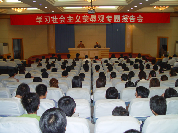 郭海波副书记结合自身的学习体会向大会作了“学习和树立社会主义荣辱观”的主题报告。他从社会主义荣辱观蕴含的时代性、民族性、针对性和实践性总体内涵和重要意义入手,讲述了学习和树立社会主义荣辱观应该做到的三个层面:一是贵在把握,就是要正确把握社会主义荣辱观的时代背景和历史意义;二是贵在理解,就是要全面理解社会主义荣辱观的深刻内涵和时代特征,社会主义荣辱观涵盖爱国主义、集体主义、社会主义思想,体现了中华民族传统美德和时代要求,是科学发展观的重要组成部分,是新时期社会主义道德的系统总结;三是贵在实践,就是要从自身做起、从小事做起,坚持不懈、持之以恒的把社会主义荣辱观教育贯彻到学习生活和工作等各项事业中去。他紧密联系师生的思想工作实际,引用大量鲜活的事例的对“八荣八耻”进行了深入浅出的阐述,受到了广大师生的热烈欢迎。广大师生纷纷表示一定要认真学习和牢固树立社会主义荣辱观,做当荣之事,拒为辱之行,不断提升道德价值观念,为创建和谐校园做出积极贡献。