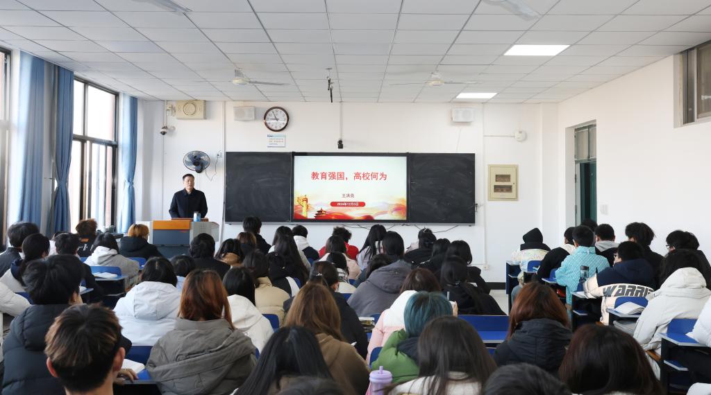 王洪亮以《教育强国,高校何为》为题,首先讲述了党的二十届三中全会公报中有关教育强国建设的内容,并结合我校实际讲到高校如何落实立德树人根本任务,最后从德智体美劳五个方面为同学们阐述作为当代大学生应该如何落实。王洪亮勉励同学们要从身边小事做起,向师生楷模学习,持续提升思想觉悟和专业技能。