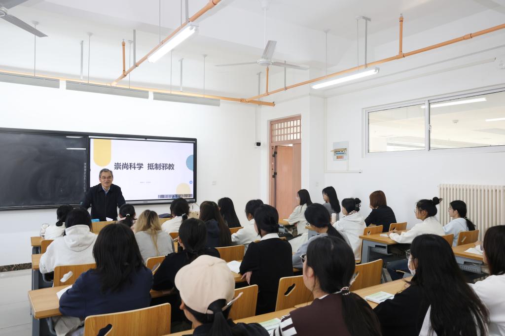 10月15日上午,校党委副书记王庆兵在弘善楼B409教室以“崇尚科学,抵制邪教”为题,为外国语学院学生60余人讲授专题思政课。