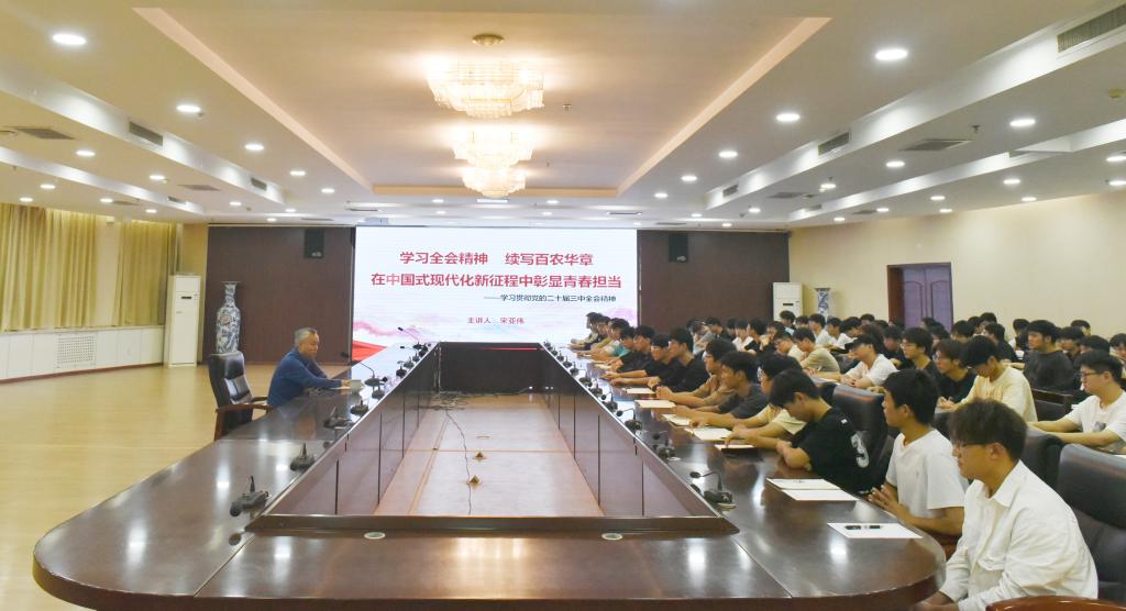 为深入学习贯彻党的二十届三中全会精神,推动全会精神进教材、进课堂、进学生头脑,9月29日下午,校党委书记宋亚伟在办公楼206会议室以《学习全会精神续写百农华章在中国式现代化新征程中彰显青春担当》为题,为学生代表90余人宣讲党的二十届三中全会精神。