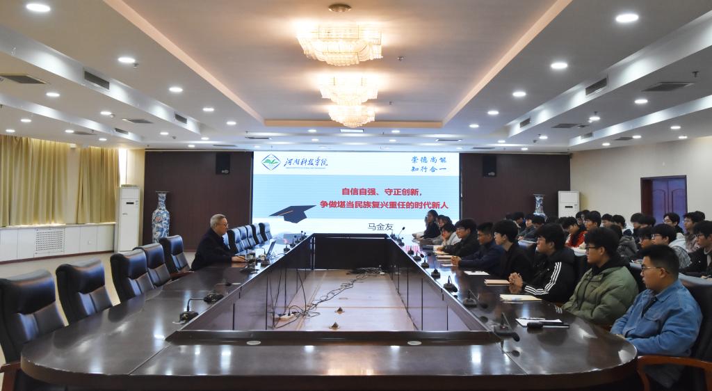 12月5日上午,副校长马金友在办公楼206会议室为机电学院60余名学生讲授思政课。