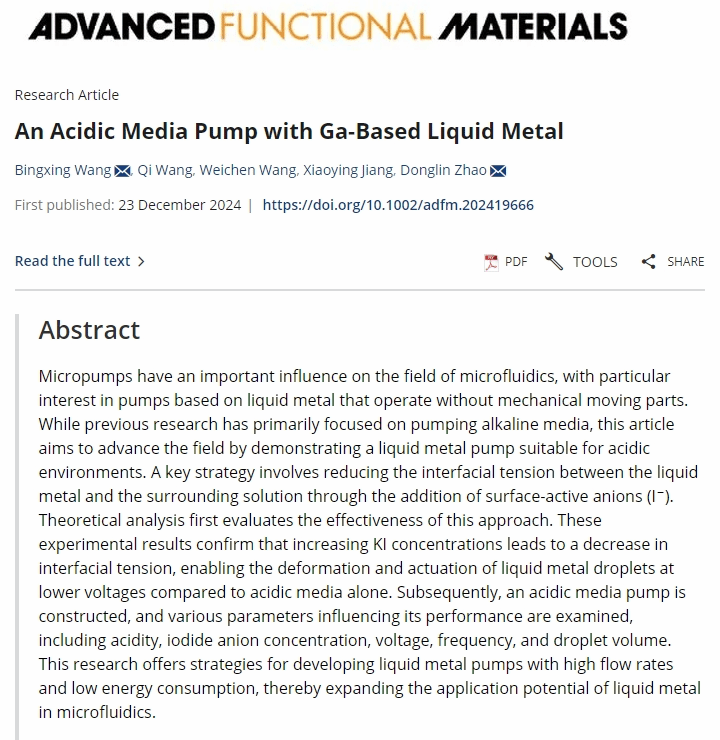 近日,我校化学化工学院王丙星副教授团队在国际顶级期刊《Advanced Functional Materials》发表题为“An Acidic Media Pump with Ga-Based Liquid Metal”的研究成果。《Advanced Functional Materials》2024年最新影响因子为18.5,是材料与化学领域广受认可的顶级期刊(中科院大类/小类一区Top期刊),同时被国际权威的自然指数评选为顶级期刊之一。河南科技学院为第一完成单位,王丙星副教授为论文的第一作者和第一通讯作者。