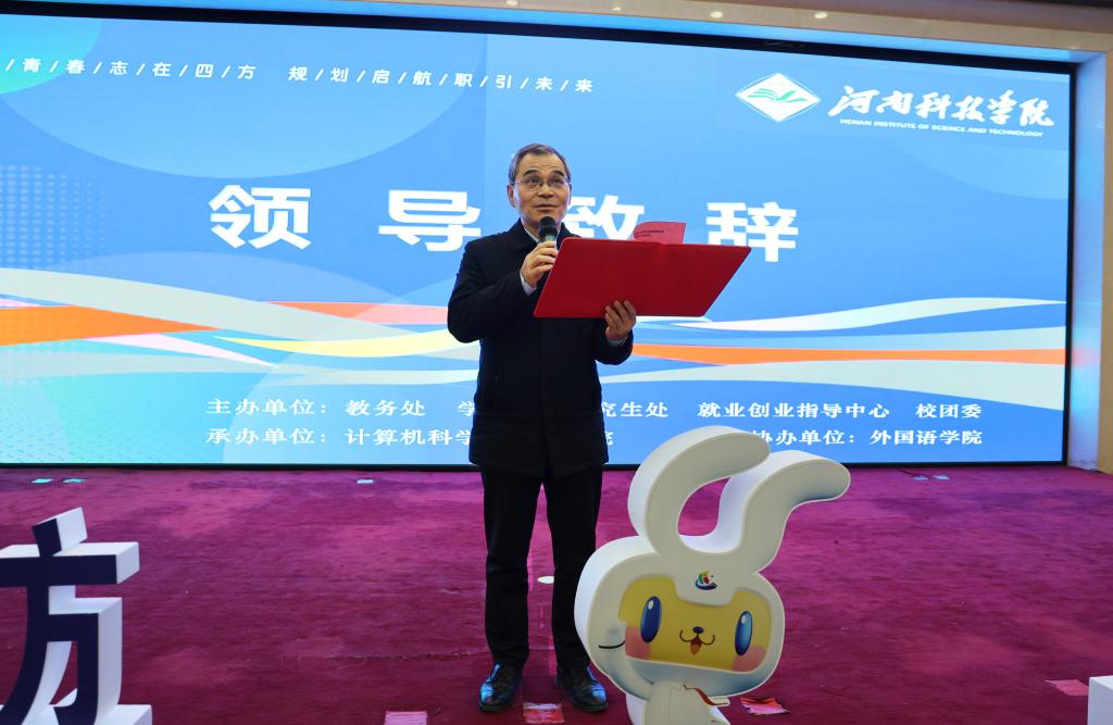 王庆兵发表致辞。他指出,职业规划是大学生人生旅程的关键指引,河南科技学院坚持“以赛促教”“以赛育人”“以赛促就”,持续深化就业创业教育教学改革,通过校企合作提升学生实践能力,通过职业指导课程、职业素养讲座和就业创业类比赛提高学生职业素养与创业精神。王庆兵鼓励与会学生以职业规划大赛为契机,将个人的职业理想融入到国家和社会的发展大局之中,以实际行动践行“请党放心,强国有我”的青春誓言。