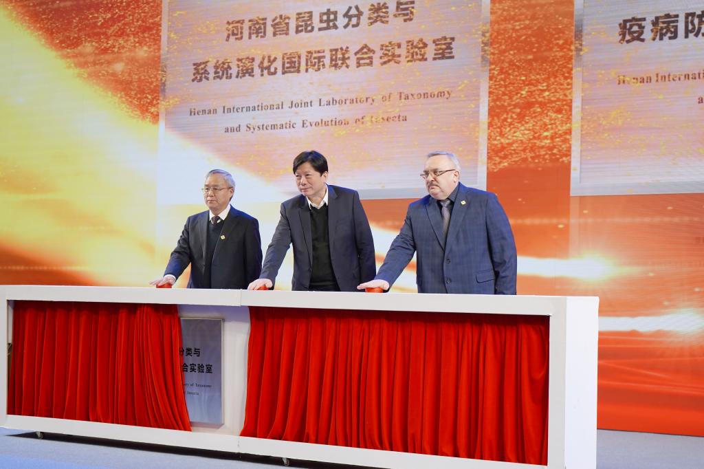 仪式上,李卫东、宋亚伟和苏梅国立农业大学兽医学专家亚历山大·卡拉什尼克,共同为“河南省昆虫分类与系统演化国际联合实验室”和“河南省动物健康养殖和疫病防控国际联合实验室”揭牌。