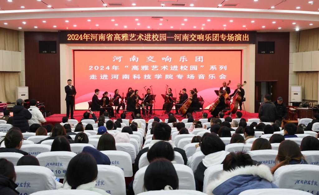 为全面落实《教育部关于全面实施学校美育浸润行动的通知》要求,不断提升当代大学生审美素养,进一步加强学校艺术教育工作,12月12日晚,由河南科技学院主办、校公共艺术教学部承办的2024年高雅艺术进校园活动之河南交响乐团专场演出在办公楼308报告厅举行。校党委副书记、工会主席姚刚及相关职能部门领导出席活动,音乐会通过线下观看+线上转播的形式同时进行,全校师生观看人数达到5000余人次。