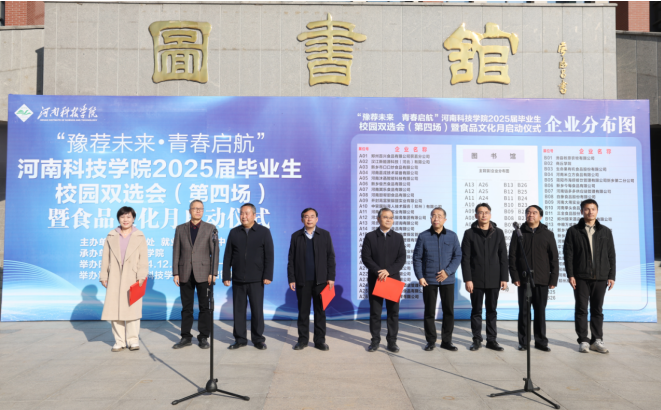 12月6日上午,“豫荐未来·青春启航”校园招聘会暨食品文化月启动仪式在启智广场开幕。校党委副书记王庆兵、副校长刘全永出席仪式。党委宣传部、教务处、学生处、校团委、食品学院、新乡市市场监督管理局食品药品检验所主要负责人及师生代表1000余人参加了此次活动。活动由食品学院负责人主持。
