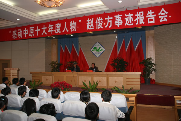 报告会上,2005年“河南省首届感动中原十大杰出人物”、“河南省教育新闻十大杰出人物”赵俊方用朴实的语言讲述了他十多年来,省吃俭用、历尽艰苦,靠在窑场等地打工挣钱资助20余名贫困生的助学先进事迹。一句句“爱”的表述、一丝丝真情的流露、一种宽广的胸襟、一种无私的奉献精神、一种坚定的助学态度无不使在座的广大师生深受感染,整个报告厅掌声不断。