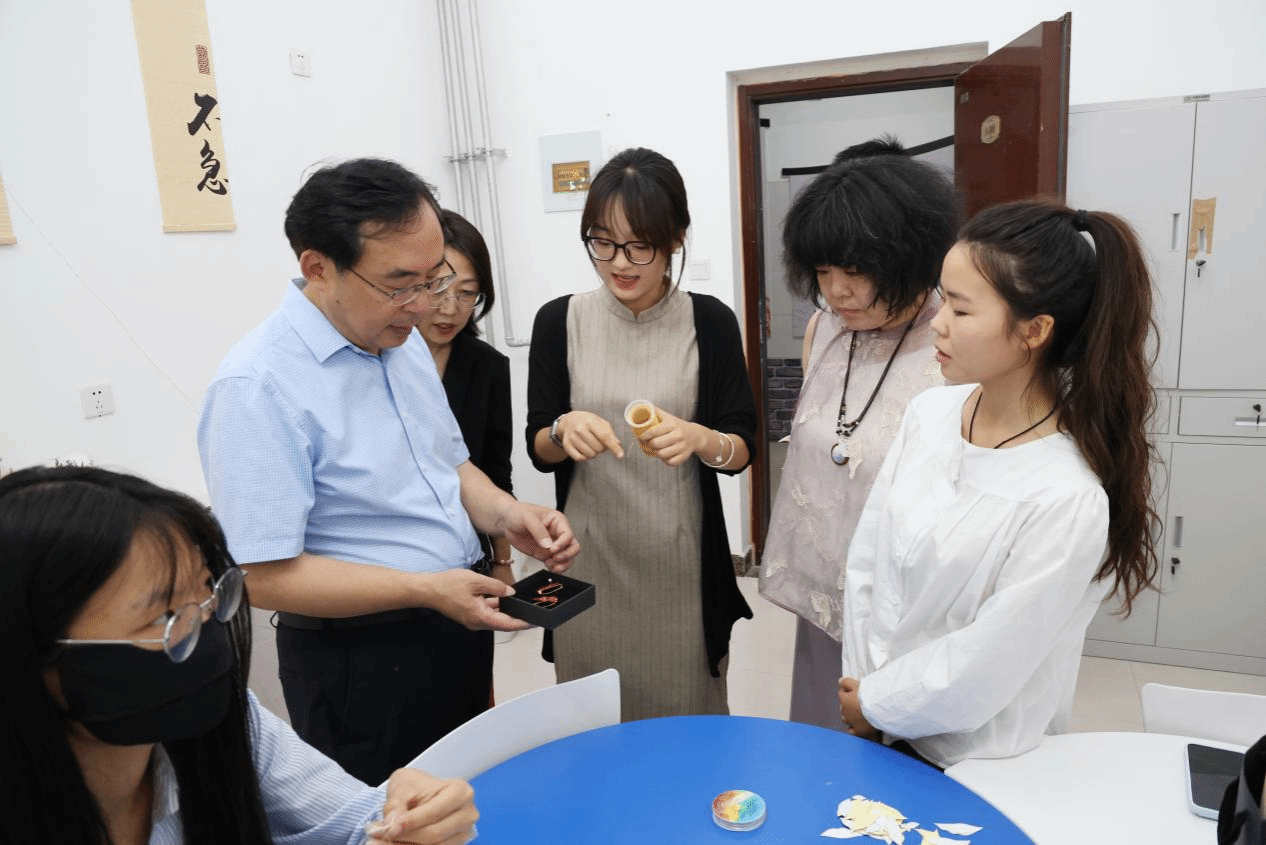 我校非遗国际传播研究中心作为特色文化传播平台,始终致力于推动非物质文化遗产的国际传播与实践创新,促进传统文化创造性转化、创新性发展,实现教育、科技、文化融合发展。调研期间,刘全永先后走访了"莳刻压花""青岫蓝染""珞言跨境"和"豫见缠花"等特色工作室,与师生亲切交流,详细了解作品制作工艺、技术难点及创作周期等情况。