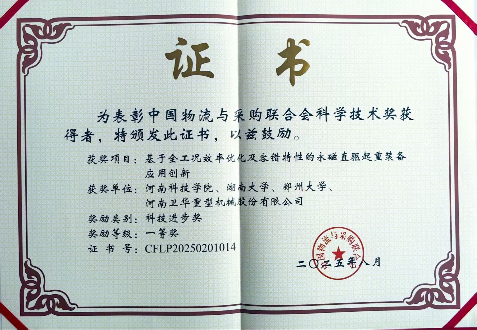 在备受瞩目的颁奖环节,由机电学院聂福全教授主持,联合湖南大学、郑州大学、卫华集团研发的科研项目《基于全工况效率优化及容错特性的永磁直驱起重装备应用创新》凭借卓越的创新性与重大工程应用价值,斩获中国物流与采购联合会最高奖一等奖。这是该团队继2023、2024年度连续两年获该奖项二等奖之后,首次实现了我校在该领域一等奖的突破,充分展现了我校工科团队的科研实力。