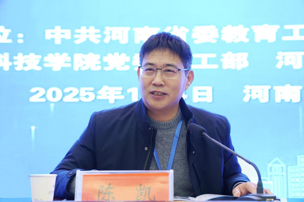 陈凯对学校思政工作取得的成绩表示肯定。他表示,河南科技学院网络思政、思政教育场馆建设、心理健康教育、思政课实践基地等方面的工作成效显著。他指出,习近平总书记提出“思想政治工作是学校各项工作的生命线”,2024年全国教育大会上把“思政引领力”放在建设教育强国“六大特质”之首,这充分彰显了思政工作在教育事业中的引领作用和战略地位。辅导员工作室是加强思政引领力的重要抓手,要将育人体系和人才培养体系相互贯通,形成“大思政”育人合力,从而更好地落实立德树人根本任务,为学生成长成才保驾护航。他强调,要加强对青年学生的思想引领,把握学生思想动态,提高政治敏感性,增强思想政治工作的针对性和实效性,为培养担当民族复兴大任的时代新人奠定坚实的思想基础。