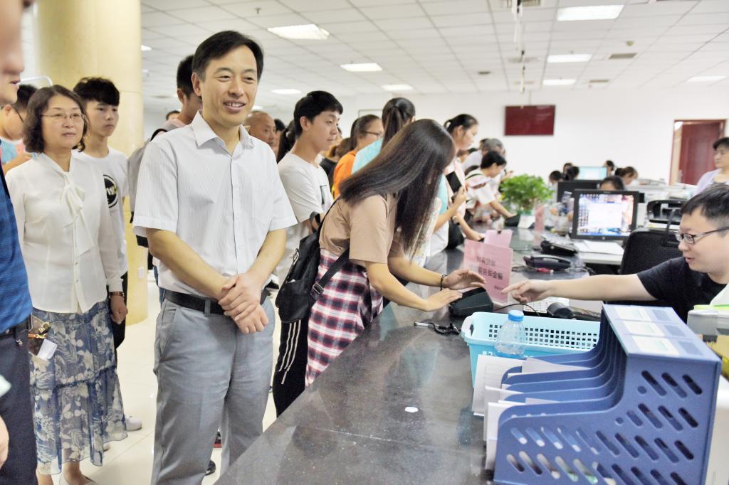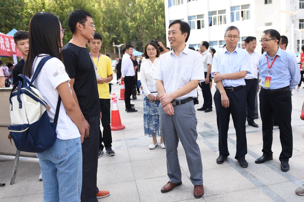 9月7日下午和9月8日上午,校领导周志远、李成伟、宋亚伟、冯启高、贺杰、王霞、贾积身等在党委办公室、校长办公室、党委宣传部、党委学工部(学生处)、校团委、后勤服务中心、保卫处等相关单位负责人的陪同下,来到迎新现场,看望慰问工作人员,并与新生及家长亲切握手交谈。每到一个学院,校领导都仔细询问迎新进展情况,嘱咐他们要认真负责地做好新生接待服务工作,努力做到让家长安心、新生满意。在与新生家长交谈过程中,校领导表示,感谢他们对学校的信任和支持,学校一定会对学生的成长成才负责,请家长朋友们放心。