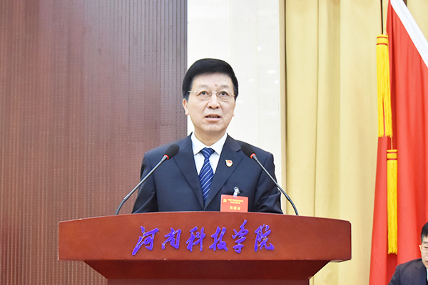 高治军代表省委高校工委、省教育厅,向大会的召开表示热烈的祝贺。他指出,近八十年来,河南科技学院秉承“艰苦奋斗,自强不息”的精神,坚持为党育人、为国育才,锻造形成了鲜明的办学特色和办学风格,为党和国家做出了自己的贡献。此次大会,是河南科技学院在新时代改革发展的关键时期召开的一次重要会议,既是师生政治生活中的一件大事,更是学校党的建设和改革发展历程中的一件要事,对于全面总结学校发展经验,认真研判学校发展形势,科学谋划学校发展战略,进一步凝聚师生员工智慧和力量,实现学校高质量快速发展,具有重大而深远的意义。希望各位代表认真履职尽责,把这次大会开成统一思想、凝聚共识的大会,发扬民主、求真务实的大会,振奋精神、促进发展的大会。希望河南科技学院继续坚持以习近平新时代中国特色社会主义思想为指导,深入学习贯彻党的十九大精神,紧紧围绕为谁培养人、培养什么样的人、怎样培养人这个根本问题,全面贯彻党的教育方针,旗帜鲜明地坚持党对学校工作的全面领导,落实立德树人根本任务,坚持“以本为本”、推进“四个回归”,培养德智体美劳全面发展的社会主义事业建设者和接班人。坚持问题导向和目标导向,不断更新教育理念,深化综合改革,从师生最关心的热点难点问题和制约学校发展的关键因素入手,敢于先行先试,勇于克难攻坚,冲破思想观念束缚,破除体制机制障碍,聚焦自身特色和优势,努力谱写新时代华丽新篇章。继续坚持立足中原、面向全国,把自身发展同国家发展、社会需求紧密结合,积极响应“一带一路”倡议,对接“三区一群”建设等国家战略,为河南经济社会发展供强有力的人才保障和智力支持。