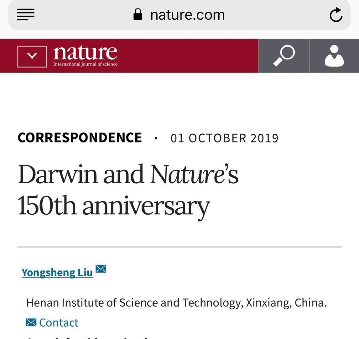 今年10月1日,《Nature》杂志在线发表了我校生命科技学院特聘教授刘用生的短篇通讯文章“Darwin andNature’s150thanniversary”(达尔文与《自然》杂志150周年)。该文将正式发表在今年第574 卷第36页,标志着“河南科技学院”的名字将首次以第一完成单位的形式展现在《Nature》杂志上。