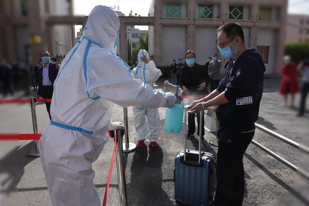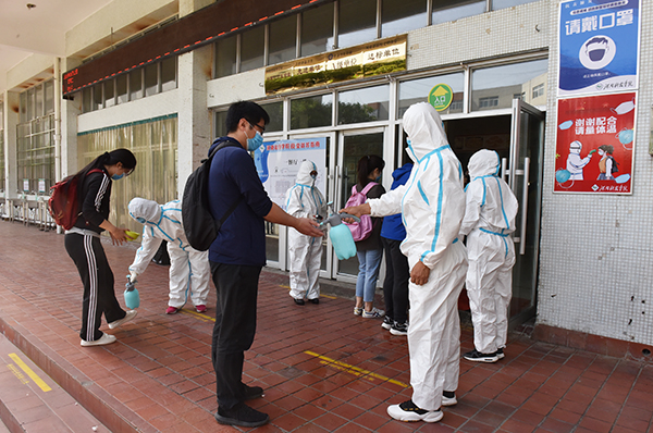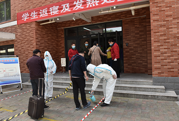 在致远广场学生报到接待点,学生们在间隔距离范围内等待完成入校手续办理,工作人员发放疫情防控常识小册子、指导学生办理手续;第一教学楼前,学生们有序排队进行消毒、体温检测。进入教室后一人一桌就坐,避免近距离接触,教师核对学生人数后开始上课;学生第一食堂前设置洗手区,学生们按照七步洗手法,洗手后自带餐具,有序排队进入食堂,一人一桌就餐;学生公寓前,学生排队消毒、测温、扫码、出示相关证件,确认为该宿舍楼人员后进入宿舍;学校相关单位工作人员按预定操作流程演练,每个环节都展示了可能出现特殊情况的应急处置方法。