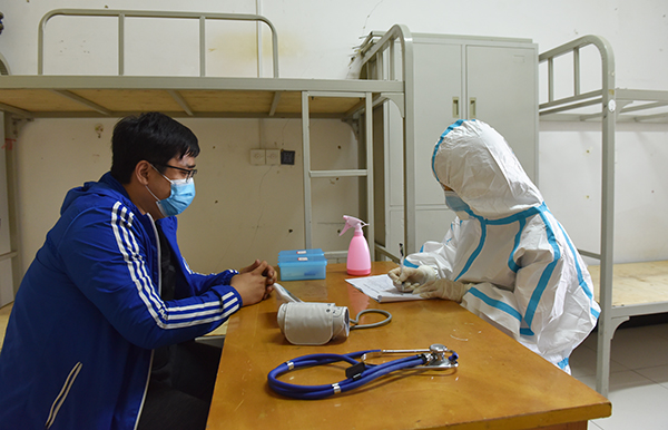 在突发事件应急处置演练环节,一名正在宿舍的“学生”自感体温异常,校医院工作人员第一时间对学生采取隔离观察,学生所在宿舍进行封闭隔离。
