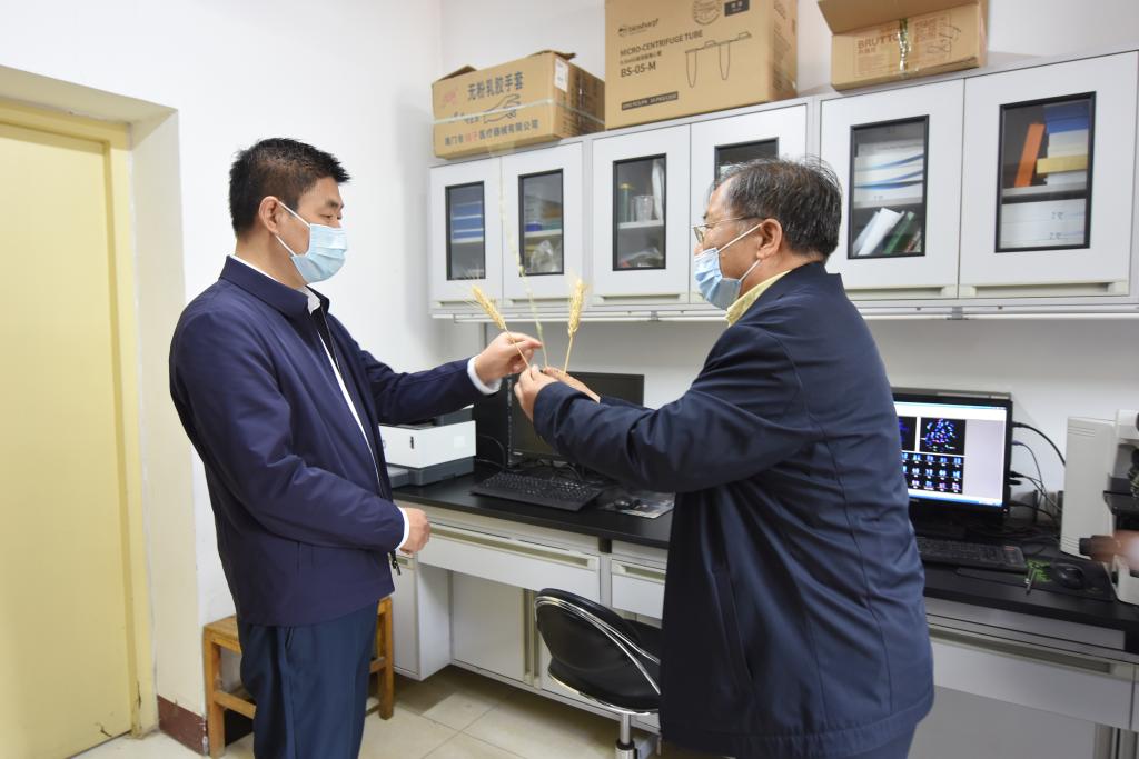 在学校西门口,宋争辉一行实地查看校门管理情况,详细了解了校园疫情防控有关工作。在小麦工程技术研究中心,仔细查看了生产应用、核型分析、品质分析等实验室,了解学校实验室建设及科技创新情况。宋争辉一行还查看了田径运动场、篮球场等相关设施的灾后恢复重建情况。