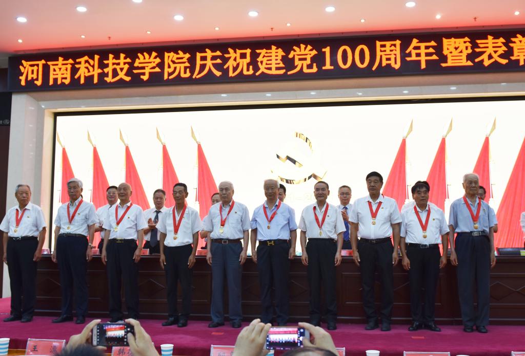 会上,校领导为老党员代表颁发“光荣在党50年”纪念章,为获得我校2020—2021学年先进基层党组织和先进个人代表颁发奖牌和证书。