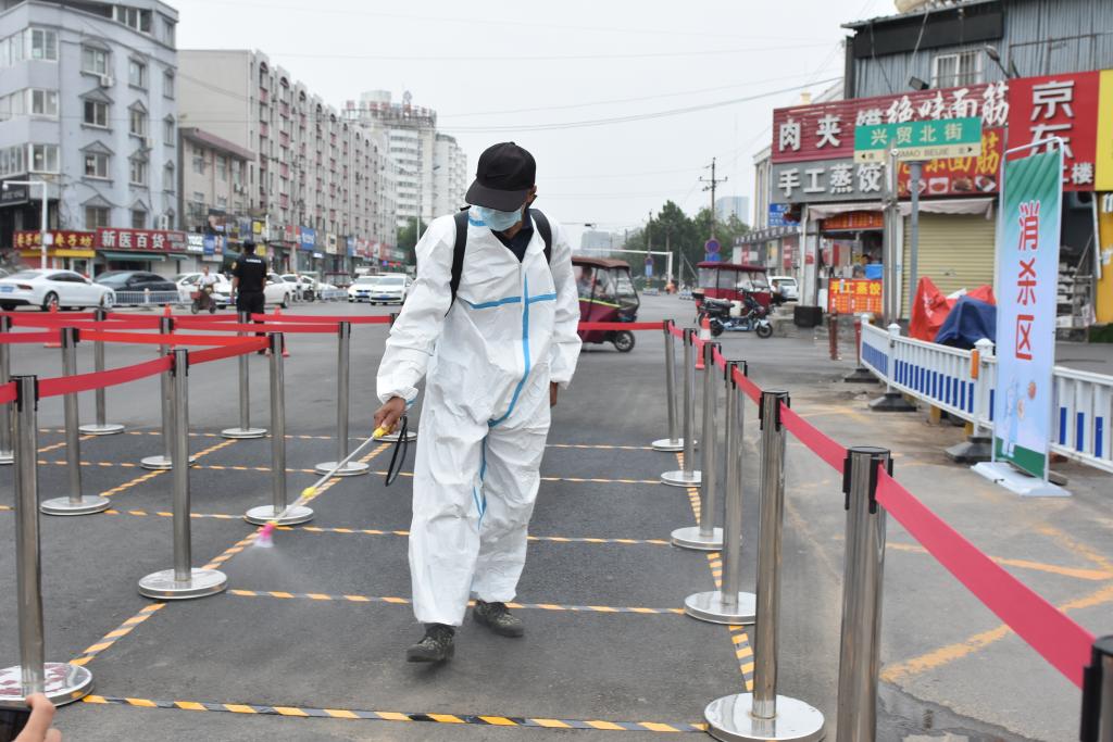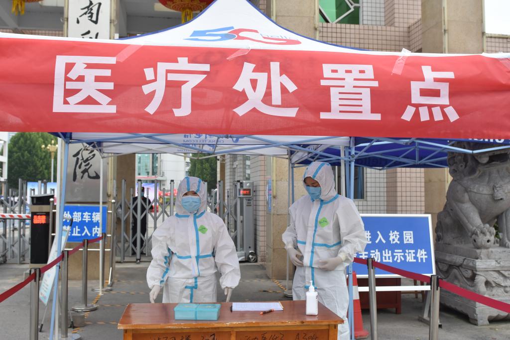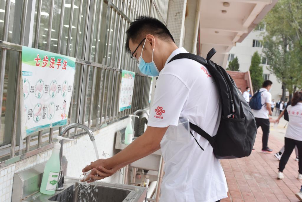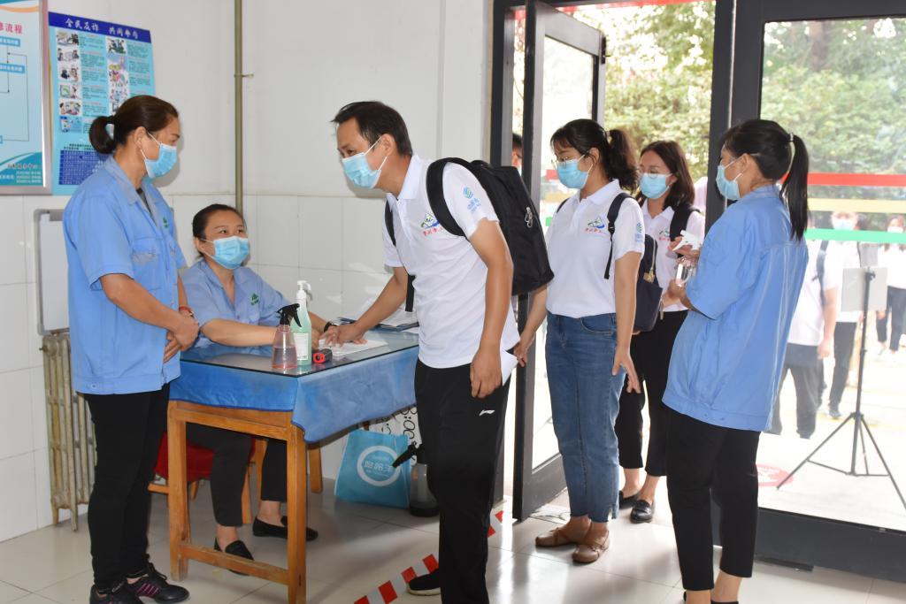 随后,学生排队进入一号楼合一教室参与课堂教学。任课教师主动到值班室进行消毒、接受测温,教室严格消杀和通风,学生全程佩戴口罩,间隔就座。