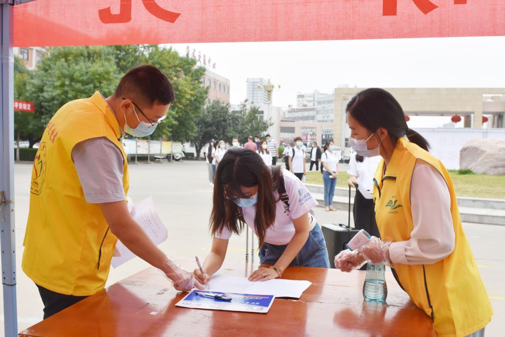 在学生返校报到演练现场,学生进门前进行卫生消杀,通过测温通道进行体温检测、身份验证后,进入校园到所在学院报到点进行健康信息核验并签订承诺书,完成入校报到手续办理。