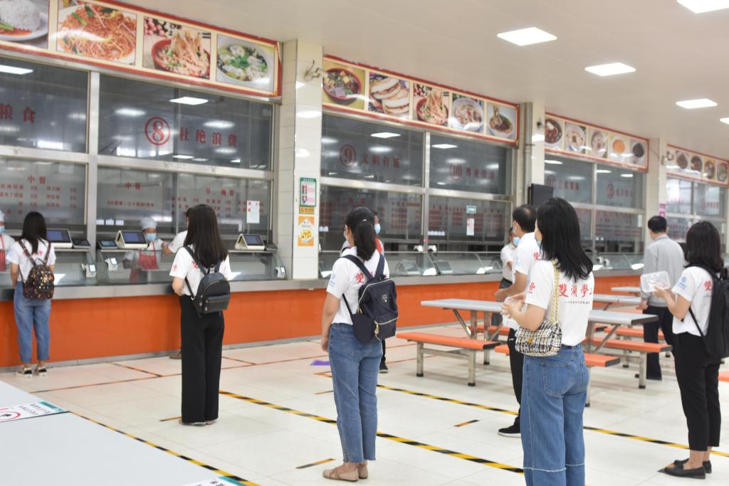 在第一餐厅演练现场,学生全部自带餐具,经洗手、测温、脚部消毒后有序进入餐厅,按地面标示线购买餐食,带回宿舍就餐。