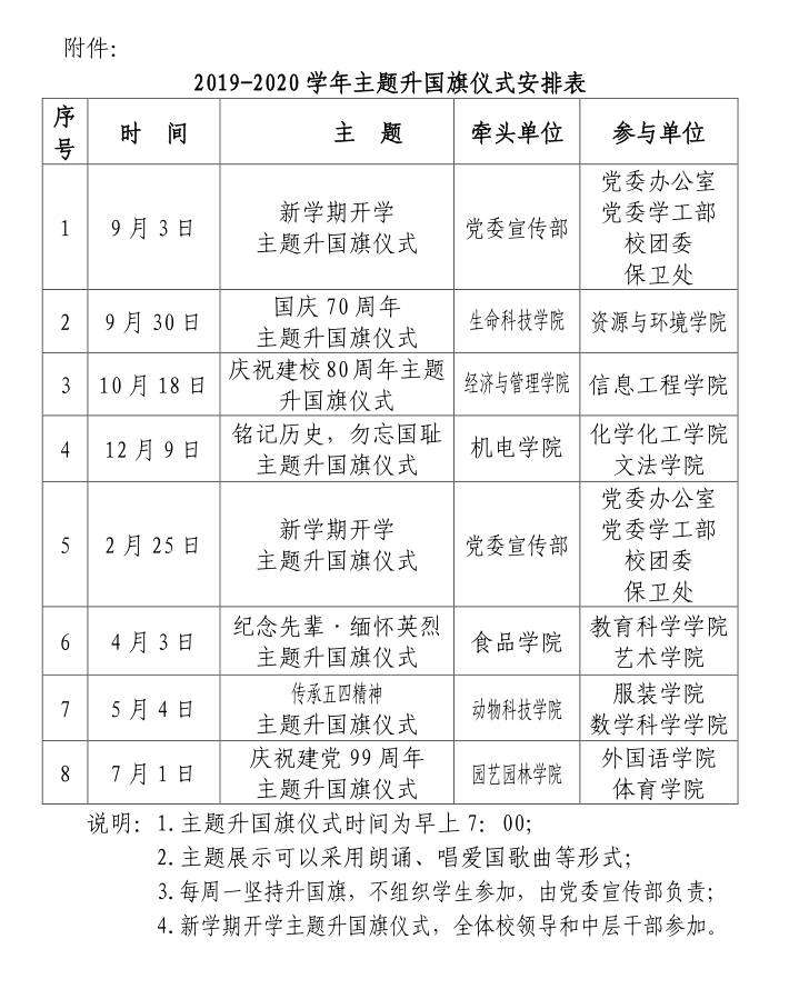 为继续开展好主题升国旗仪式,根据《河南科技学院关于开展主题升国旗仪式的实施方案(试行)》(校宣字〔2017〕12号),现将2019-2020学年主题升国旗仪式安排通知如下(详见附件)。希望各基层党委、相关部门继续重视此项工作,支持此工作,进一步突出仪式主题、丰富仪式内容、增强育人效果,把主题升国旗仪式做实做好。