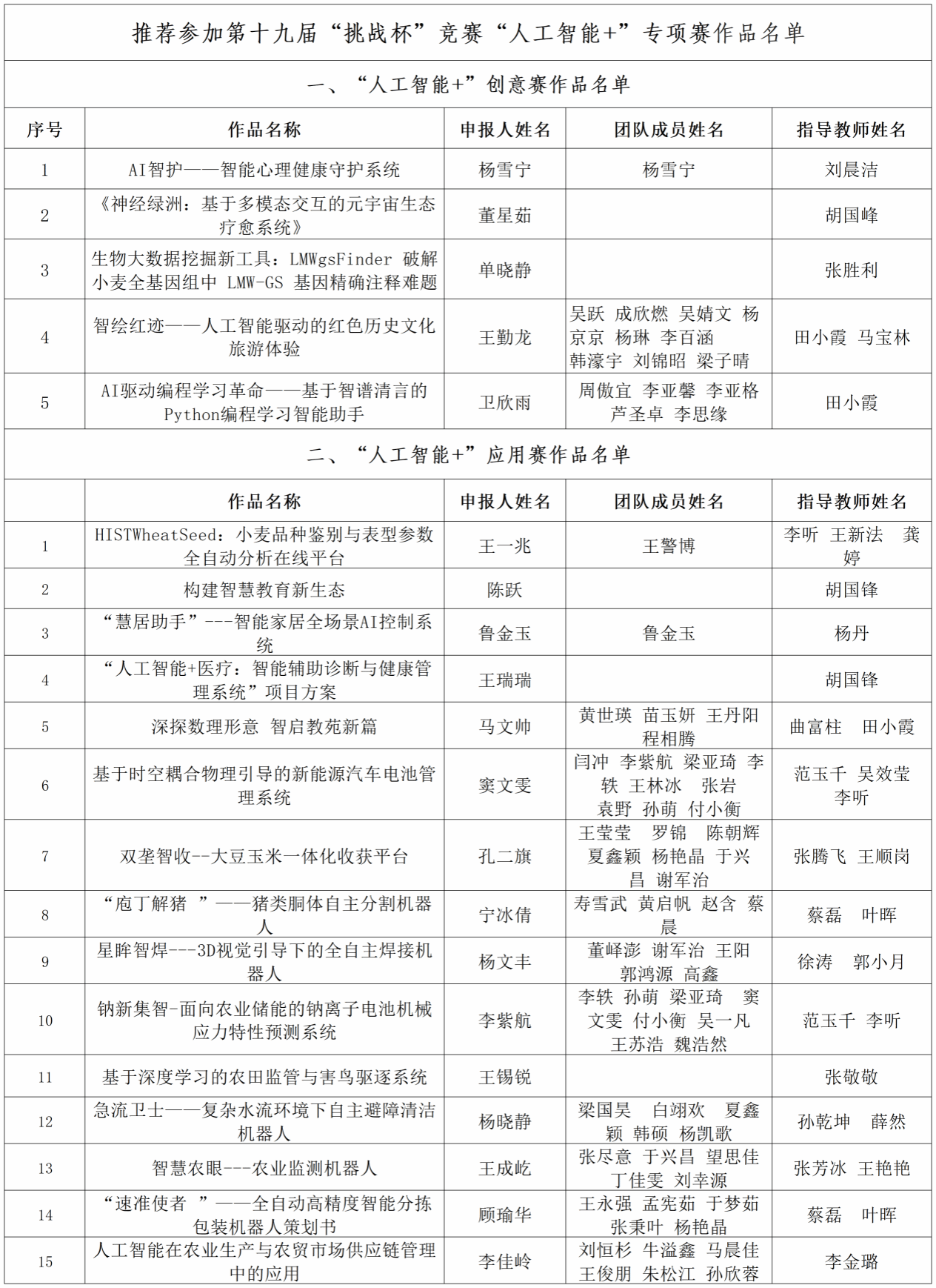 按照第十九届“挑战杯”赛事“人工智能+”专项赛工作安排,校团委面向全校举办第十九届“挑战杯”全国大学生课外学术科技作品竞赛“人工智能+”专项赛,共涵盖“人工智能+”创意赛、“人工智能+”应用赛、“人工智能+”挑战赛三个赛道。经个人申报、校团委审核,现将推荐参加第十九届“挑战杯”竞赛“人工智能+”专项赛作品进行公示,公示时间自2025年7月14日至7月18日,共5天,如有异议,请在公示期间及时反映。
