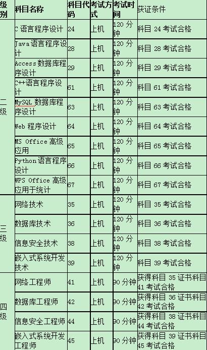 全国计算机等级考试实行百分制计分,但以等第分数通知考生成绩,分别为优秀、及格、不及格。由教育部考试中心颁发合格证书。自2019年3月考试起,二级语言类及数据库类科目(即除MS Office高级应用外的其他二级科目)调整获证条件为:总分达到60分且选择题得分达到50%及以上(即选择题得分要达到20分及以上)的考生方可获得合格证书。