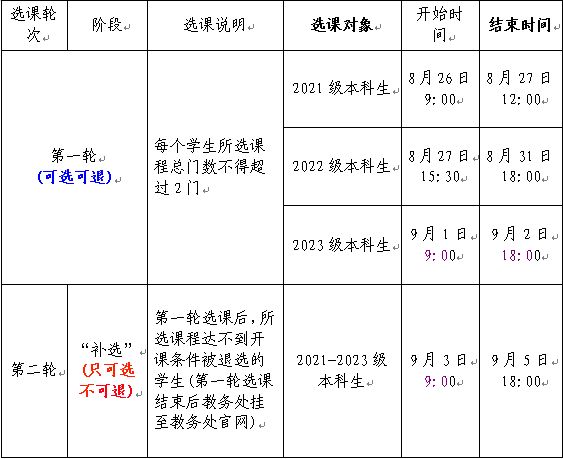(1)选课时间说明:学生务必在系统规定时间按时完成选课。第一轮选课完成后,选课人数达不到开课要求的课程将被取消开课,届时第一轮选了该课程的学生需在第二轮的选课中重新选课。具体课程请关注通知公告。