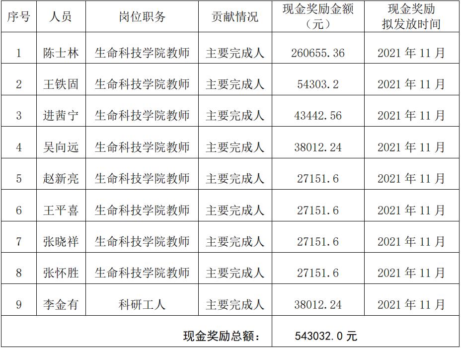 根据《中华人民共和国促进科技成果转化法》《关于科技人员取得职务科技成果转化现金奖励信息公示办法的通知》(国科发政〔2018〕103号)《河南科技学院科技成果管理办法(修订)》(校发字[2020]22号),现对我校“百玉5875”和“百玉9337”成果转化的现金奖励相关信息公示如下: