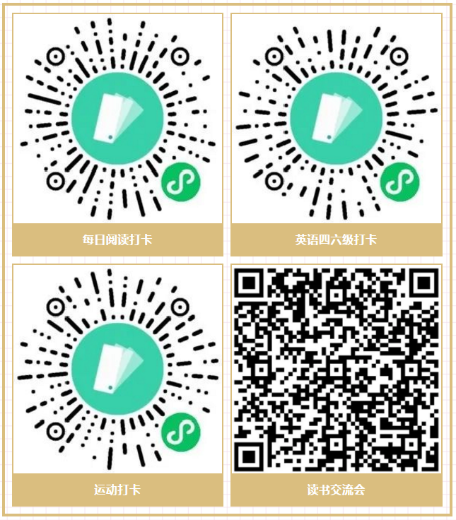 (1)线上打卡活动。通过微信小程序“小打卡”,搜索找到“每日阅读打卡”“英语四六级打卡”“运动打卡”并加入打卡圈子。每天通过主题阅读、四六级主题学习和运动发布自己的打卡,转发评论打卡推送,还可以点赞、评论、互动。