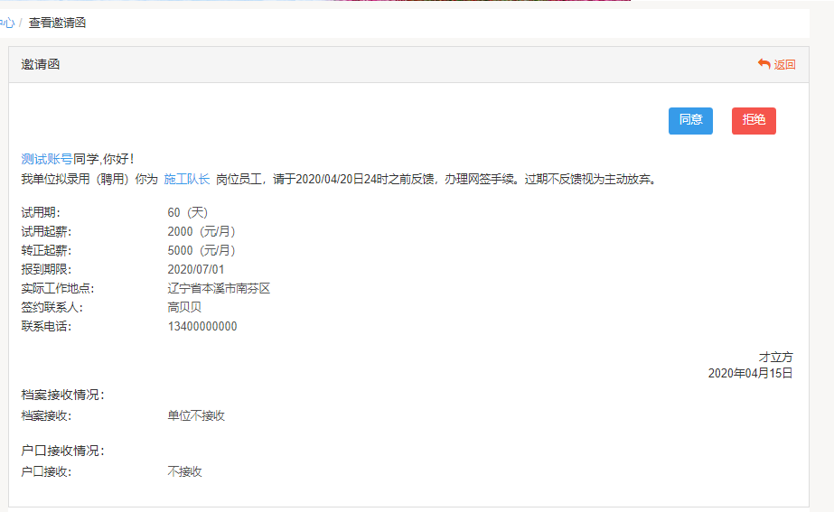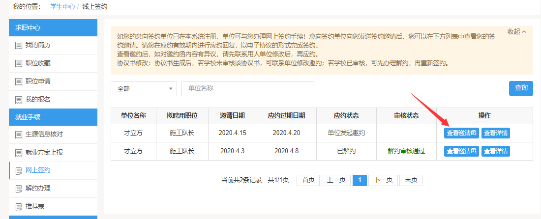 3.签约前,请仔细逐项查看邀约信息,如有问题请选择拒绝应邀,并填写拒绝原因告知用人单位。毕业生重新签约,须按照学校解约流程办理,经学校招生就业处审核后生效。