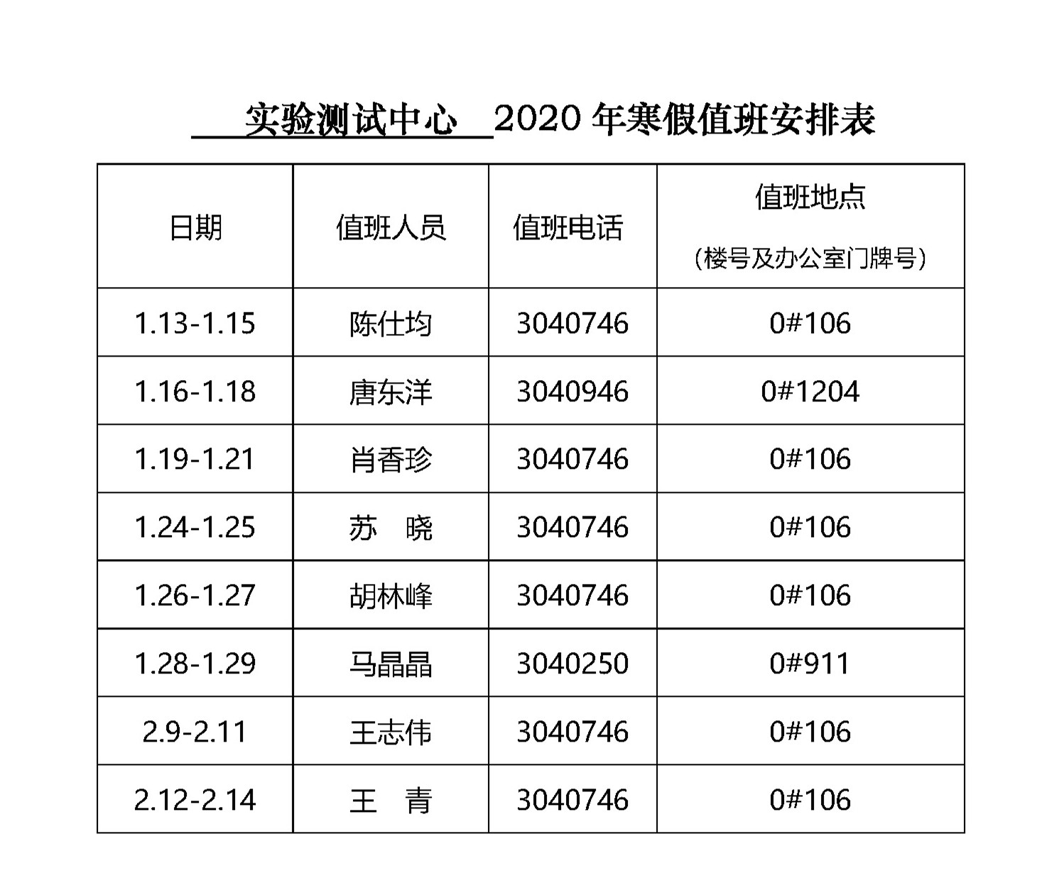 根据学校寒假放假安排,为保证师生科研工作的顺利开展,2020年寒假期间实验测试中心轮休值班安排如下: