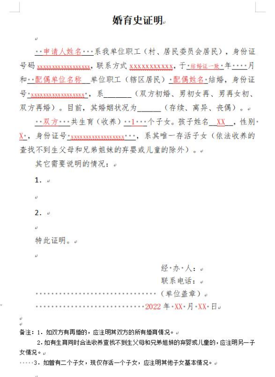 2.婚育史证明2份(见附件,须手写,不得复印);