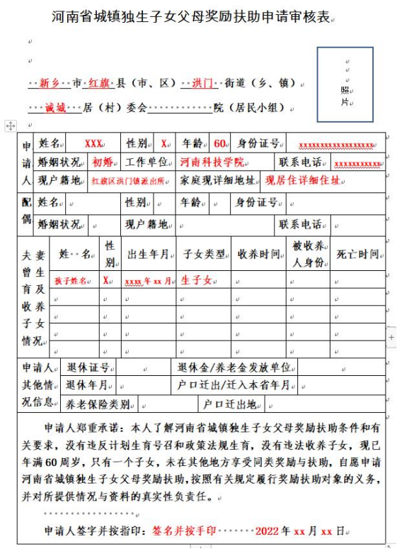1.河南省城镇独生子女父母奖励扶助申请审核表2份(见附件,须手写,不得复印);