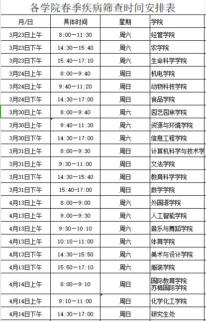 春季是呼吸道传染病的高发季节,学生是呼吸道传染病易感人群之一,为做好春季传染病防控工作,切实保障广大师生身体健康和生命安全,维护学校正常教育教学秩序,按照上级有关文件要求,学校决定于3月23日-4月14日,在我校大学生中开展春季传染病防治检查工作。请各学院高度重视,按照通知要求,认真组织学生,在规定时间到校医院进行防控检查。